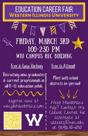 Western Illinois University will host two Education Career Fairs, one in-person event, from 1-2:30 p.m. Friday, March 3 at the Student Recreation Center, and one virtual, from 3:30-6 p.m. Wednesday, March 8. Both events are free for WIU students and current professionals to attend.