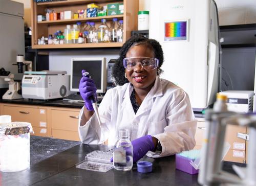 Funmilola Favour Anjorin, of Macomb, will graduate in May with a master’s degree in Chemistry. She said cancer research has been one of her passions for several years, and she came to Western after learning about work being done here by Associate Professor of Chemistry Mette Soendergaard.