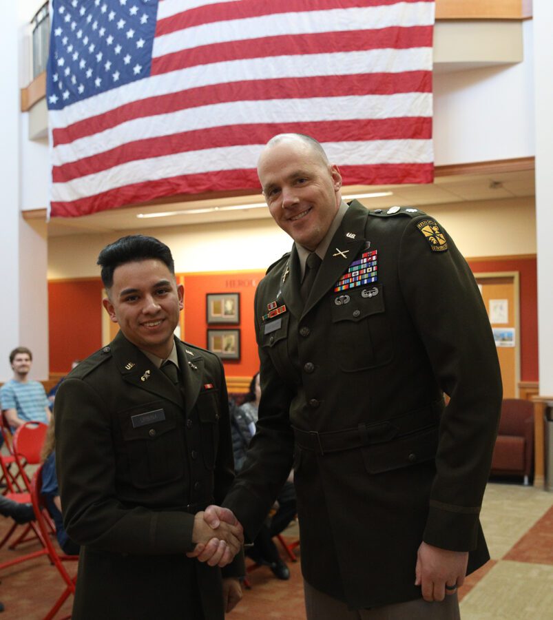 The ceremony for Martinez-Urbina was held in the Veterans Memorial Great Room in the College’s Center for Science and Business and marked the completion of his Reserve Officers’ Training Corps instruction.