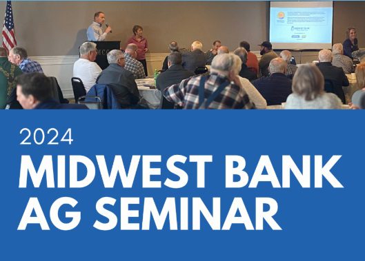 Gillen, Executive Vice President of Lending, and Quinn, Assistant Vice President of Ag Lending, with Midwest Bank highlight the details of the upcoming Ag Seminar on March 5th at the Monmouth Country Club, with remarks from panelists Mike Downey, Lauren Lurkins, Lindsay Mitchell, and David Zimmerman.