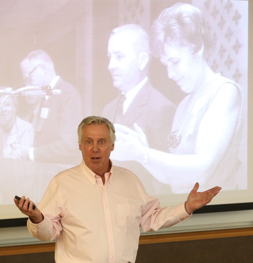 Sid Stockdale, author of a memoir titled A World Apart: Growing Up Stockdale During Vietnam, spoke Wednesday at Monmouth College, the school his father, Vice Adm. James Stockdale ’46, attended from nearby Abingdon, Illinois, before beginning his military service during World War II.