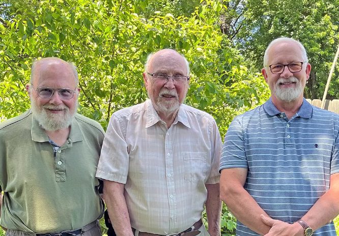 William Urban is flanked by Tom Sienkewicz, left, and Jeff Rankin, co-editors of his upcoming Festschrift.
