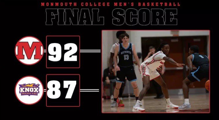 The Monmouth College men’s basketball team jumped out to a big lead and held on to win at rival Knox 92-87 on Saturday. The first-place Fighting Scots (14-5, 8-2) put four players in double figures and picked up 82 points from their starters in their fifth straight win.