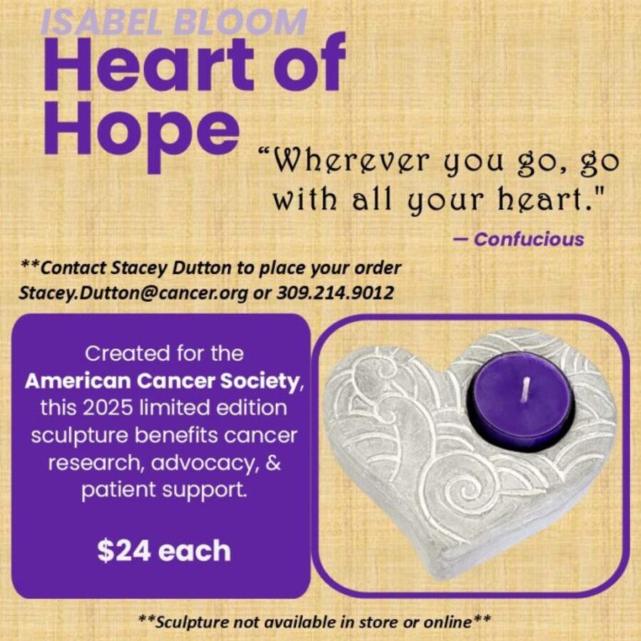 The Heart of Hope Isabel Bloom sculpture, which benefits cancer research, advocacy, and patient support, can be purchased locally for $24 at Midwest Bank in Monmouth and Oquawka.