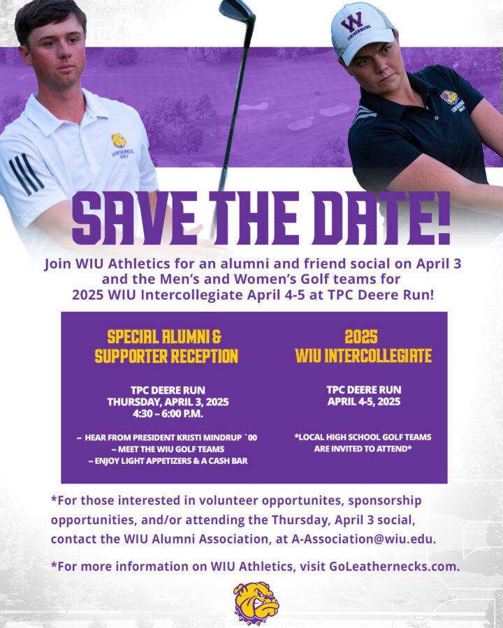 In advance of the start of the tournament, WIU alumni and supporters are invited to a special reception from 4:30-6 p.m., Thursday, April 3, at TPC Deere Run. Attendees will have a chance to meet the WIU golf teams and hear from WIU President Kristi Mindrup and Athletic Director Paul Bubb, while enjoying light appetizers and a cash bar. The event welcomes all WIU alumni and those interested in supporting Leatherneck men’s and women’s golf.