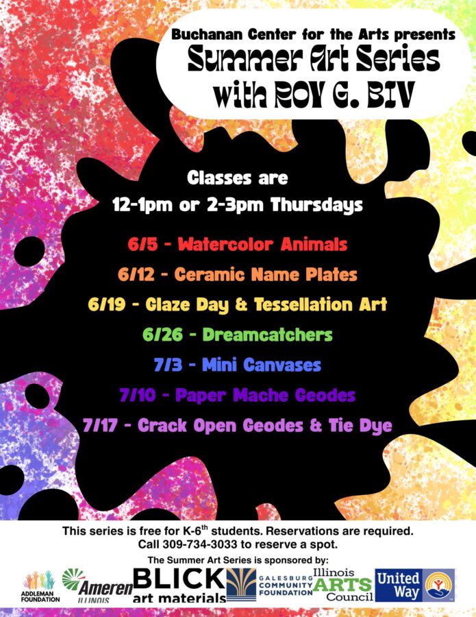 “There are no more spots available from the 12 to 1 pm slot, but we have ten or so slots available from 2 to 3 pm. Our Summer Arts program is a seven-week program, starting Thursday, June 5th and it will be every Thursday until July 17th. These classes are free and meant for kids in kindergarten through sixth grade, however if you have students who are older, we absolutely accept them as well. Students are not required to sign up for all the classes but may if they choose. These classes are only made possible by the generosity of our community through the Addleman Foundation, Ameren Illinois, Blick Art Materials, Galesburg Community Foundation, and the Unted Way of Greater Warren County.”