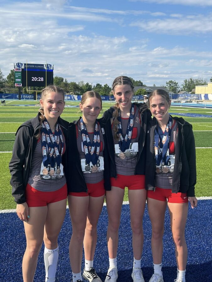 The United Red Storm girls track team brought home three medals from the IHSA class 1A state finals on Saturday in Charleston. The 4×200 relay team placed 2nd, the 4×400 relay crossed the finish in 3rd and the 4×100 relay team was 5th. Each team was made up of seniors Rosie and Katie Flynn and Emrick Huston and sophomore Callie Hall. All three relay teams brought home hardware in 2024 as well. In and extremely fast race, the 4×400 relay team broke the United school record by five seconds in just over 4 minutes. That time was just a little over a second behind the first place team on Saturday. With the points from those three finishes, the Red Storm placed 16th in the state in the team standings.