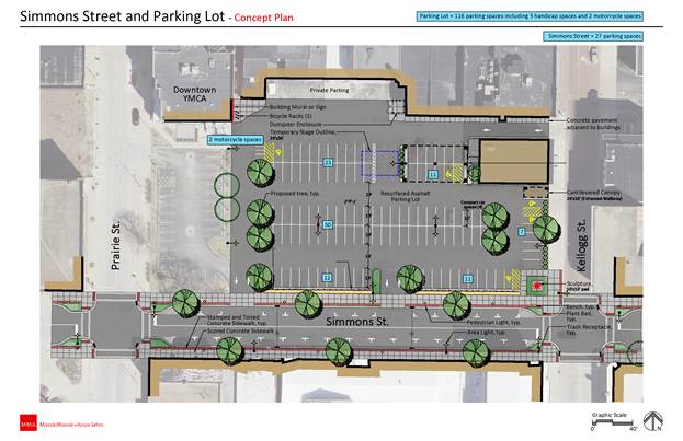 Since its start on March 31, 2025, the project has achieved major milestones, including the completion of work on the majority of Simmons Street, the Prairie Street intersection, and the west half of the parking lot. All storm sewer work is complete, and decorative lighting has been installed.