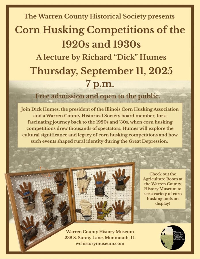 Dick Humes, the president of the Illinois Corn Husking Association, will tell us about these competitions, which were a big deal in the 1920s and ’30s. A good husker could pick over 100 bushels of corn a day. Today, a combine can harvest 2,000 bushels an hour!