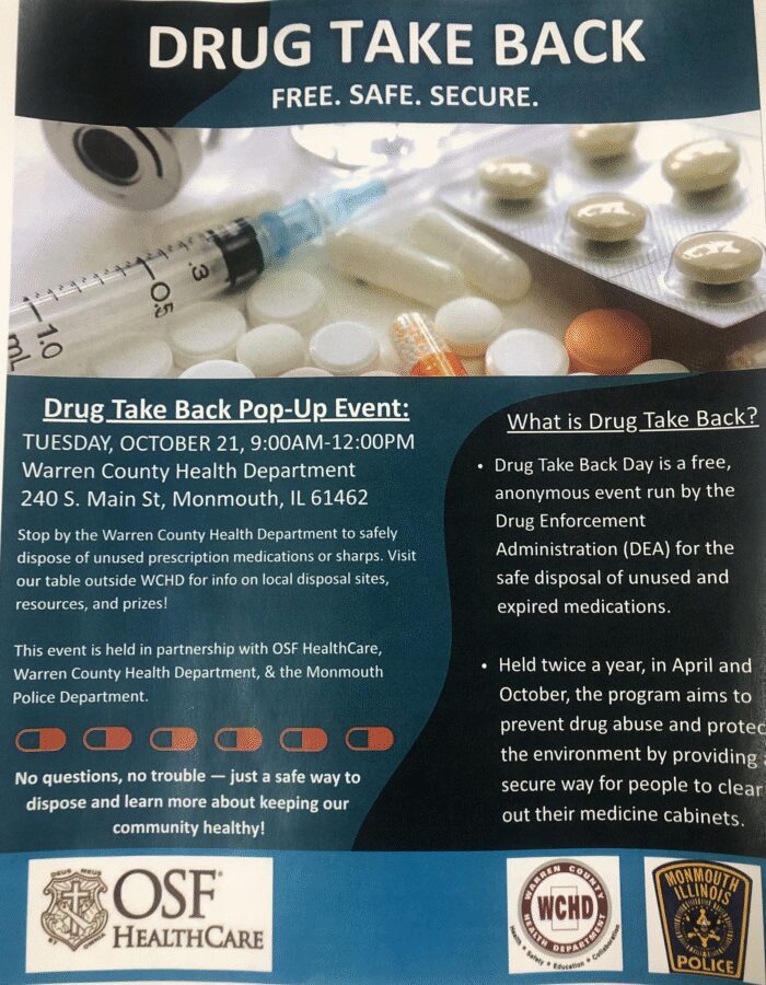 Safe – Free – Secure disposal of unused prescription drugs. Tuesday, October 21, 9am-12pm, Warren County IL Health Department