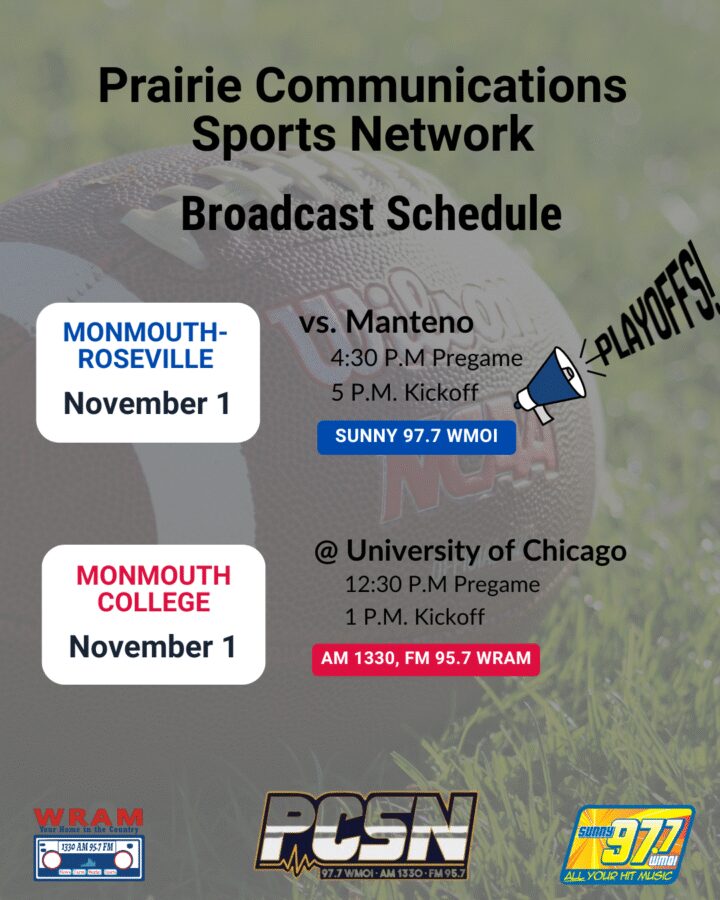 A Midwest Conference battle between Monmouth College and the University of Chicago starts the broadcast day, followed by an IHSA Class 3A First Round Playoff match up featuring the Monmouth-Roseville Titans and the Manteno Panthers. Hear both games on the radio, live online at radiomonmouth.com and on our free 97.7 WMOI and 1330 WRAM apps for your smartphone or tablet.