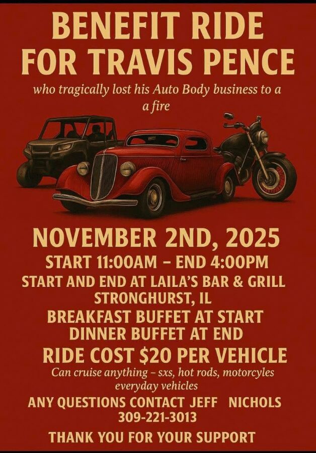 In early October, local business owner Travis Pence unfortunately lost his automotive repair shop, Stronghurst Collision and Repair, to a fire. This Sunday, November 2nd, members of the Stronghurst community and surrounding area are hosting a benefit ride to support Travis, reports Jeff Nichols: