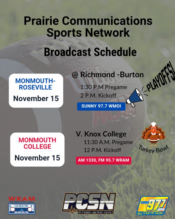 We’ll have two more big football games on the PCSN on Saturday. First up, the Midwest Conference champion Monmouth College Fighting Scots host the Knox College Prairie Fire for the annual Bronze Turkey Trophy. Then, the Monmouth-Roseville Titans travel to Richmond-Burton High School for a class 3A quarterfinal against the Rockets. If you’re going to the game, you can still listen via your smartphone or tablet. Download the 97.7 WMOI or 1330 WRAM apps and listen with a pair of headphones or ear buds.