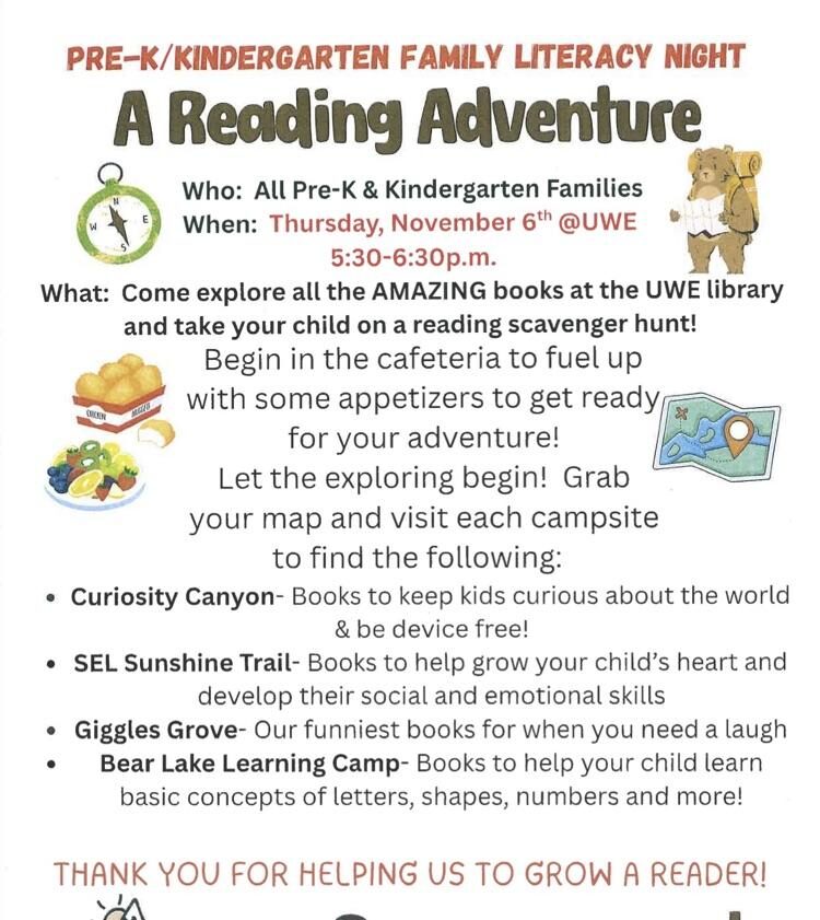 All pre-k and kindergarten families are invited to United West Elementary on Thursday, November 6th from 5:30 to 6:30 pm for a family literacy night to explore the books in the library and go on a reading scavenger hunt.