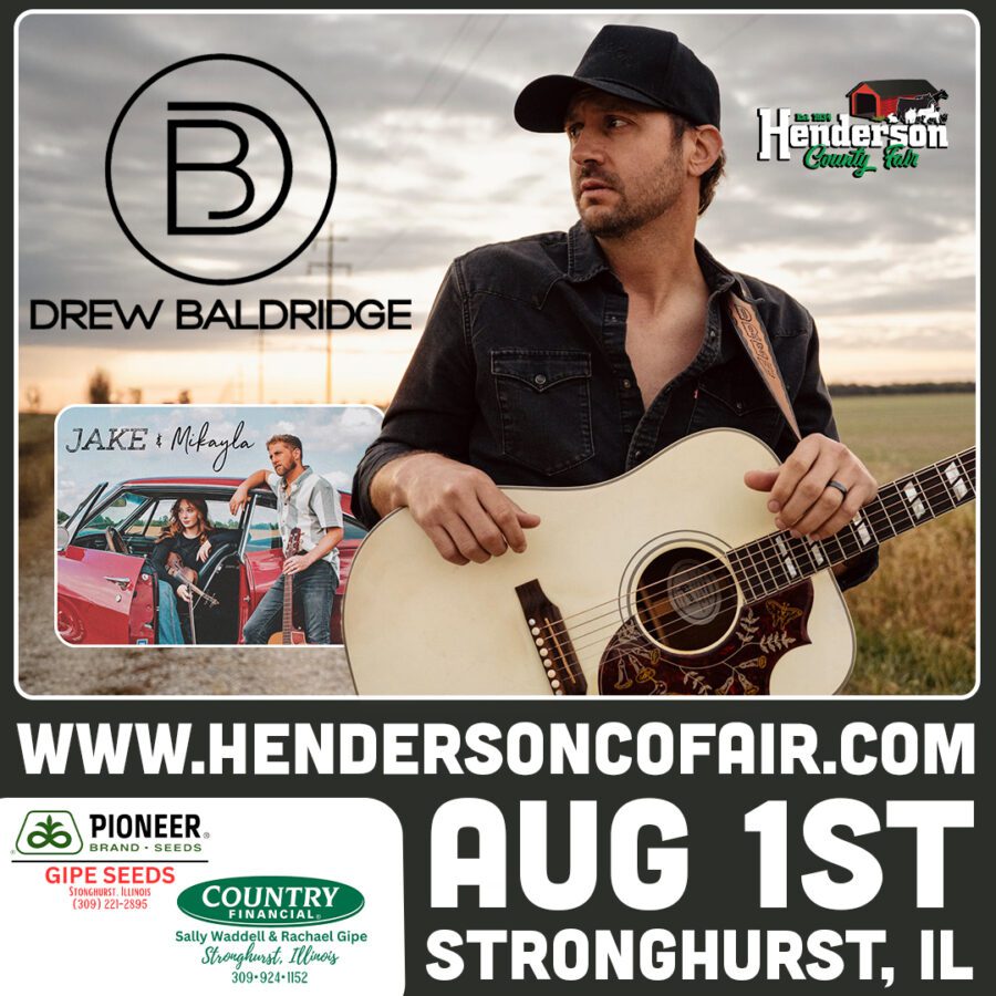 The Henderson County Fair Board is thrilled to announce the 2026 concert lineup at the fairgrounds! On Saturday, August 1, in Stronghurst, Illinois, the spotlight shines on headliner Drew Baldridge. Hailing from Illinois, Baldridge has made history—his breakout hit, “She’s Somebody’s Daughter,” became the first independently released debut single to reach No. 1 on the Country Aircheck/Mediabase chart, released on his own Lyric Ridge Records. The now RIAA Gold-certified ballad has earned over 1.1 billion streams and impressions, and stands as the highest-charting self-funded song ever on the Billboard Country Airplay chart.