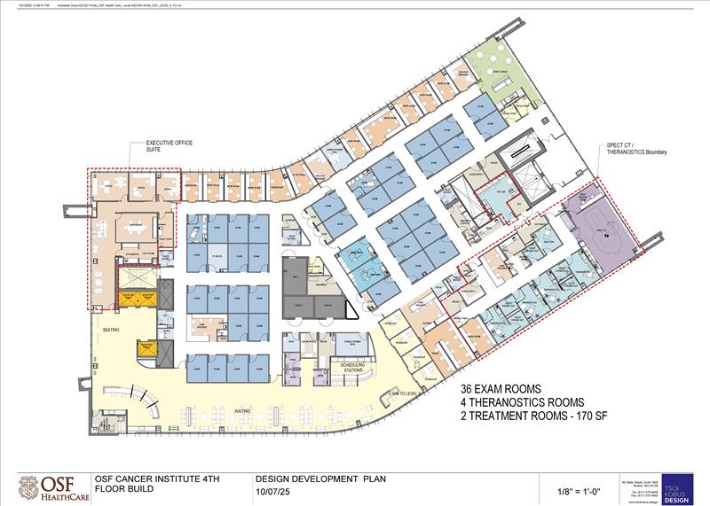 This new area will occupy over 29,000 square feet and will allow OSF to further expand its integrated cancer care network to include robust medical oncology, surgical oncology, and research components. The fourth floor will also allow expansion of OSF’s theranostics (diagnostics and therapeutics) program, private rooms for infusion create space for more clinical trials to take place at OSF Cancer Institute.