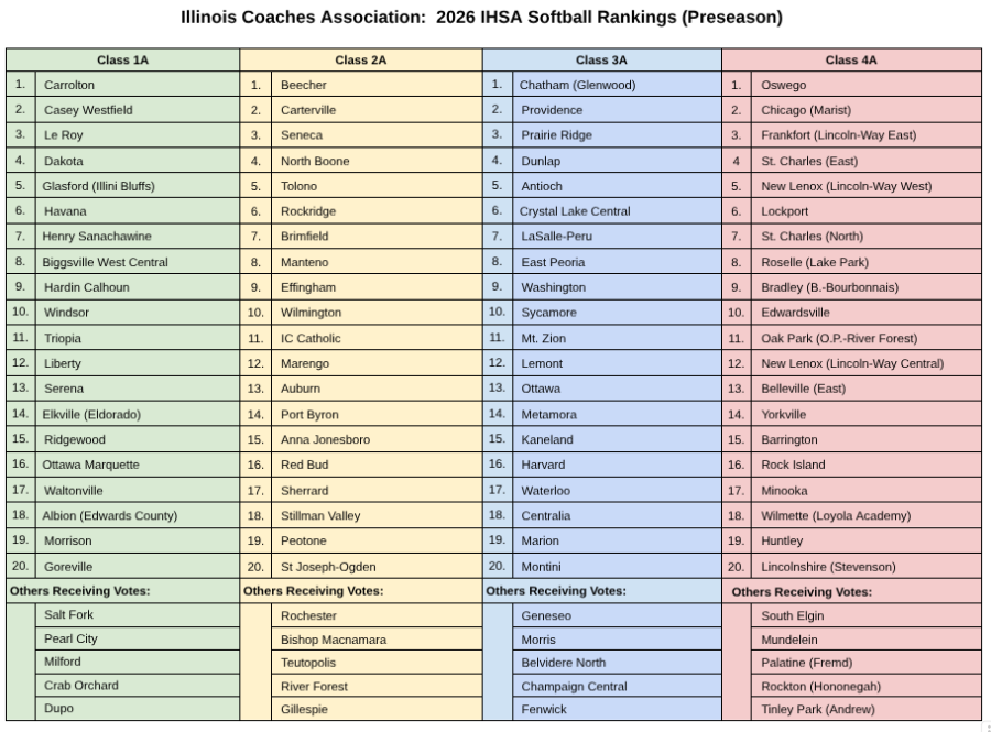 The preseason rankings are out for the Illinois Coaches Association poll. In class 1A, the top four teams in the poll are the same four teams that were in the final four in 2025. Last spring’s champs, Carrolton, is the #1 team to start this season, as well. Locally in the 1A poll, Illini Bluffs, the 2024 state runnerup is ranked #5. Prairieland Conference member Havana is #6. The Lincoln Trail Conference is represented by West Central at #8 and 2023 state champ, Ridgewood, at #15.