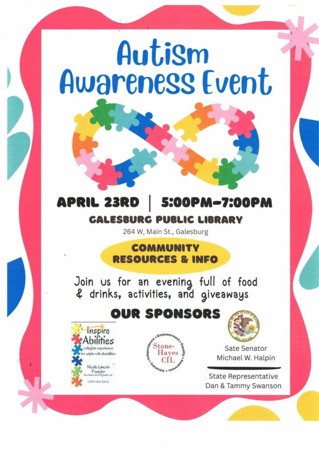The 4th Annual Autism Awareness Event will be held on April 23rd, from 5-7PM at the Galesburg Public Library supported by Senator Mike Halpin, the Stone Hayes Center for Independent Living and State Representative Dan Swanson. The event is held annually to help local residents learn more about Autism and to show your support in bringing awareness to the Autism community. There will be food, drinks and activities for all ages as well as some giveaways. Local event coordinator Nicholas McMahill shares how he wanted to design an event about autism for the community after his own autism diagnosis around the 9th grade: