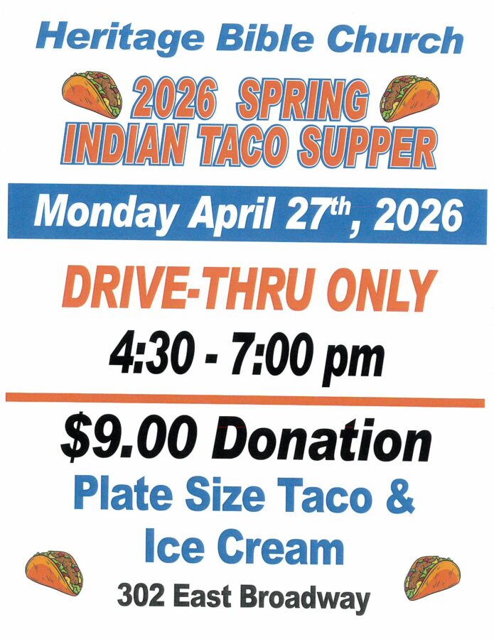 For a $9.00 donation, you will receive a plate size taco and ice cream during the Heritage Bible Church’s Indian Taco Supper.