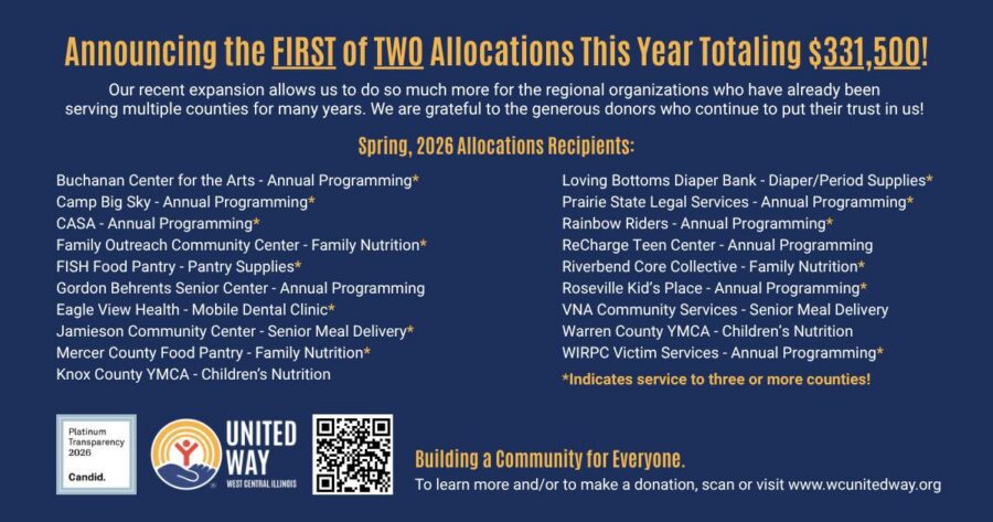 Thanks to donations big and small, the United Way of West Central Illinois is overjoyed to announce that they are able to distribute $331,500 to regional organizations serving families in Henderson, Knox, Mercer, and Warren counties right now! And… this is only the first of two allocations grant opportunities in 2026!