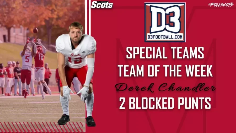 Chandler was named Midwest Conference Special Teams Performer of the Week on Monday. The Scots have a bye this week before heading to Grinnell on Oct. 4.