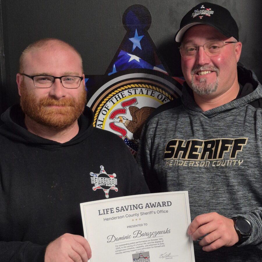 Deputy Dominic Barszczewski was honored with the Henderson County Sheriff’s Office Life Saving Award for his commendable actions on October 10th, 2025. He responded to a single-vehicle accident in rural Oquawka, IL, where a car had veered off the road and hit an embankment. The female driver suffered severe ankle injuries resulting in arterial bleeding. Recognizing the critical nature of her condition, Deputy Barszczewski applied tourniquets to both legs, effectively stopping the bleeding. Medical professionals including EMTs, paramedics, and doctors agreed that his prompt intervention was crucial in saving the woman’s life.