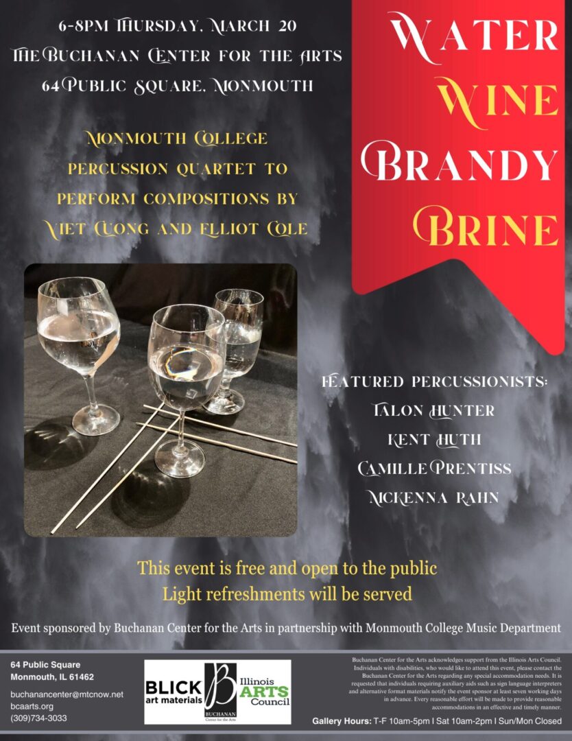 This Thursday, March 20th, the Buchanan Center for the Arts will be featuring the Percussion Quartet Water, Wine, Brandy, Brine